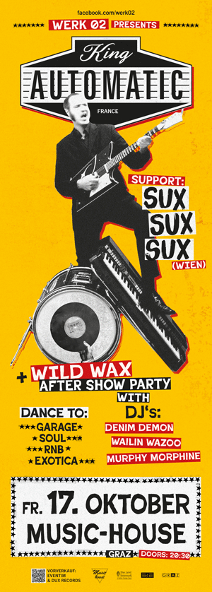 King Automatic ist weit mehr als ein Singer/Songwriter mit Band – er ist ein Ein-Mann-Orchester, der live alle Instrumente und Sounds selbst erzeugt. Er greift auf Loops, Samples und Liveschleifen zurück, um mit Gitarre, Harfe, Schlagzeug, Orgel und weiteren Klangquellen dichte Soundlandschaften zu schaffen. Sein Stil lässt sich nicht einfach in eine Schublade stecken: Er kombiniert Garagen- und Trashrock mit Blues, Rocksteady, exotischen Rhythmen und musikalischen Referenzen von Westafrika bis Jamaika. Ursprünglich Drummer bei der französischen Punkband Thundercrack, setzte er Mitte der 2000er Jahre seinen Wandel fort und begann, sich als Solointerpret neu zu erfinden. Sux Sux Sux – Chaos am Strand Stell dir vor, du verbringst einen Tag am Strand mit The Mummies und Black Lips – genau so klingt Sux Sux Sux! Ehemals Salami Sux aus Wien und St. Paul/Texas, liefern sie dreckigen Garage-Punk, Trash-Humor und pure Energie. Zieh deine Shorts an, schnapp dir deinen Salami-Recorder und lass dich vom Sound blasten!